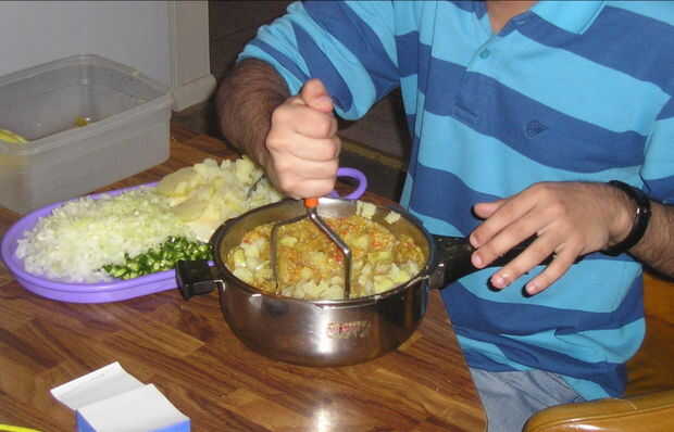Puré la mezcla de patatas y otras verduras las hervida del paso 2. La pasta resultante se llama gravy (¿es esto correcto ortografía?). Este negocio de trituración es la parte más difícil ya que requiere bastante esfuerzo. Asegúrese de que son puré de guisantes tanto como sea posible.