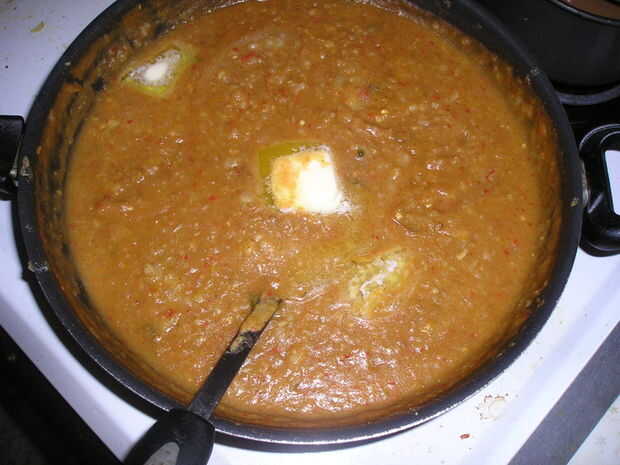 Añadir suficiente agua y jugo de carne a la cacerola. De calor a medio gas durante 15-20 minutos. Mantener revolviendo. Añadir cantidades aproximadas de estas especias (Masala) - sal, polvo de chiles rojo y polvo de la cúrcuma, comino cilantro (dhana jeeru), garam masala, masala Pav bhaji. Bhaji es listo si sabe bien!