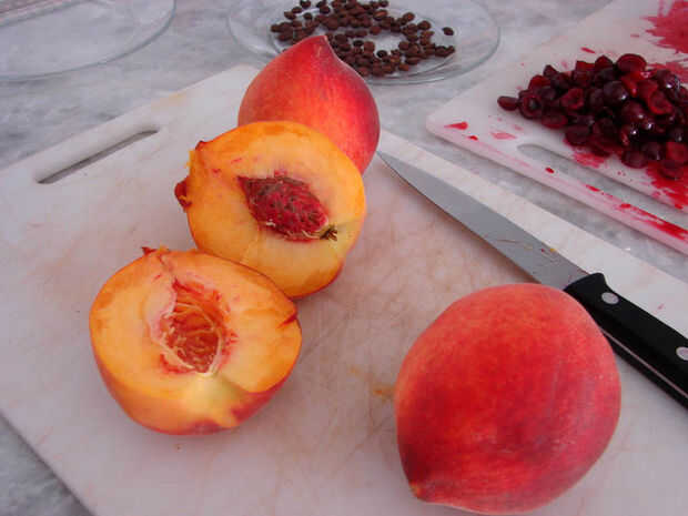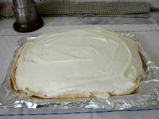 Una vez enfriado, retirar del horno y cubra con crema batida. Para complementar el dulzor del merengue te sugiero cubrir con frutas con sabor picantes en rodajas. Aquí uso los melocotones y cerezas, pero tengo que decir la fruta de kiwi o fresas son más tradicionales.