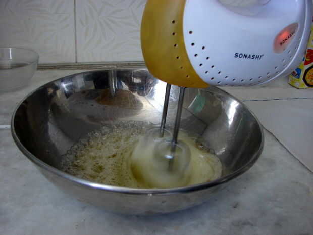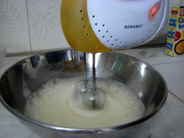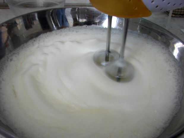 Separar claras en un bol y batir con la batidora hasta que esté espesa (conserva su forma).  Una vez hice esto sin un mezclador, usando dos tenedores en su lugar.  Recomiendo el mezclador. Consejo: recomiendo que separar sus blancos en un contenedor intermedio para evitar cualquier indeseado yema contaminando el recipiente entero.