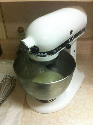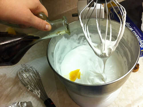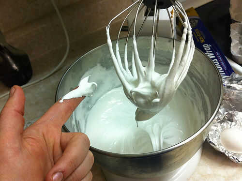Una vez calientes las claras de huevo, batir la mezcla con el batidor de globo hasta que es liso, brillante y tiene picos. He añadido un chorrito de vainilla (casera) extracto al final, pero no es necesario.