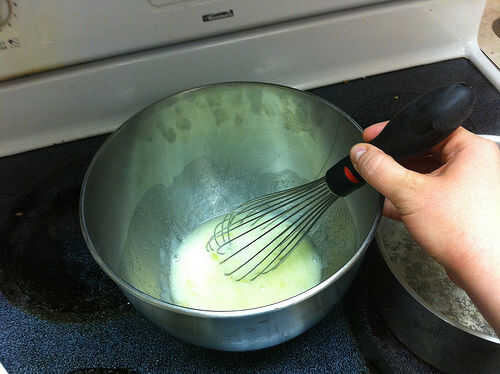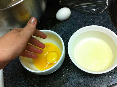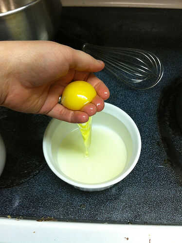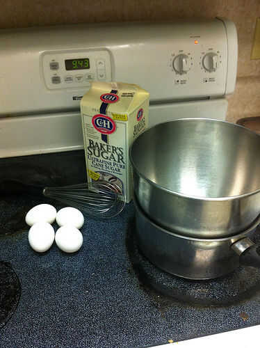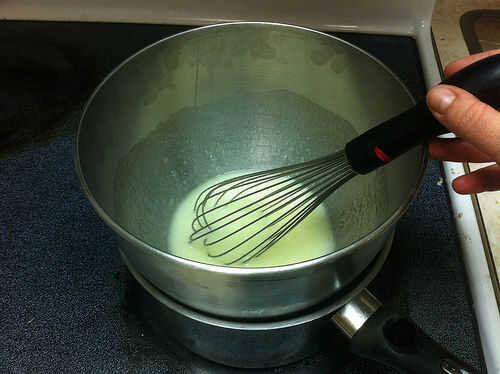Separe los huevos y salvar las yemas para la crema de limón. Batir las claras de huevo y el azúcar en la taza de metal de una batidora. Coloque el recipiente sobre fuego lento el agua y bata constantemente hasta que las claras de huevo son calientes al tacto y todo el azúcar se disuelva. Cocinar suavemente las claras ligeramente con el azúcar como se funda guarda los blancos de ser golpeado más tarde y ahorra la necesidad de cremor tártaro.