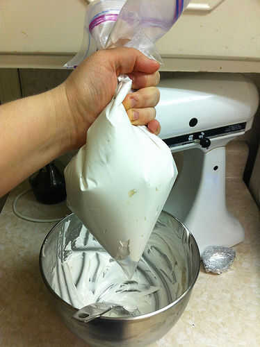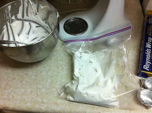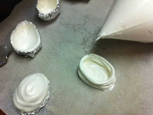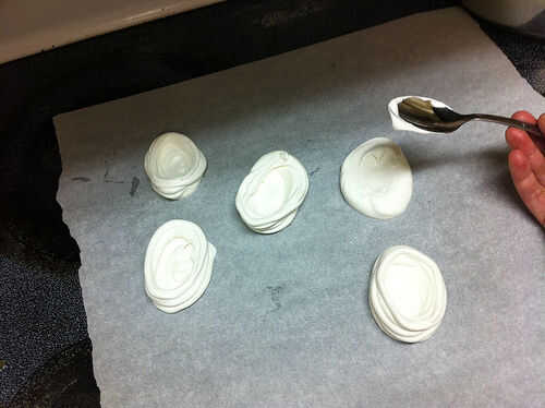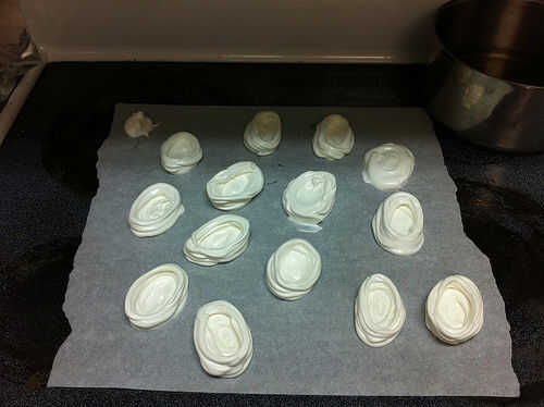 Gire el horno a 175 grados F y formas ovaladas de pipa en una bandeja forrada con papel pergamino. Trazar el contorno de la forma de huevo poco a poco construir algunas paredes. Si les genera demasiado alta, te derrumbe. Si esto sucede, sacar el merengue en la bolsa y vuelva a intentarlo.