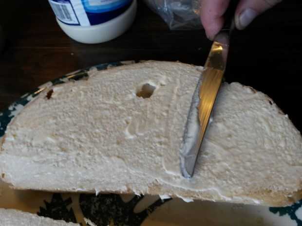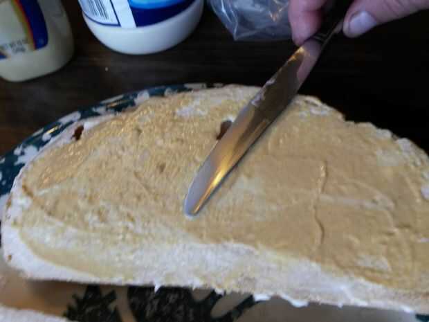 Repartidos el mayo el pan cubriendo toda la superficie. Prefiero una cubierta ligera de mayo en cada segmento, seguido por una ligera capa de dijon en el segmento inferior.