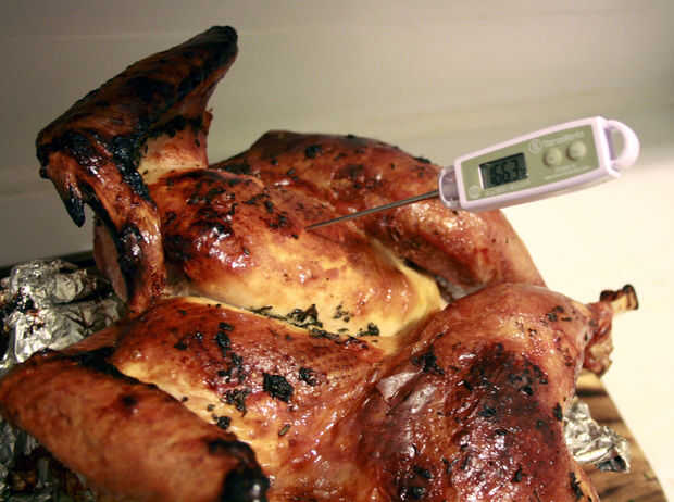 Desea un termómetro de lectura instantánea para leer 165F (74C) cuando se insertan en la parte más gruesa de la pechuga y 175F (80 ° C) en la parte más gruesa del muslo.