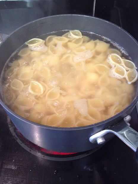 Mientras tanto, hervir la pasta en una olla grande con agua hirviendo