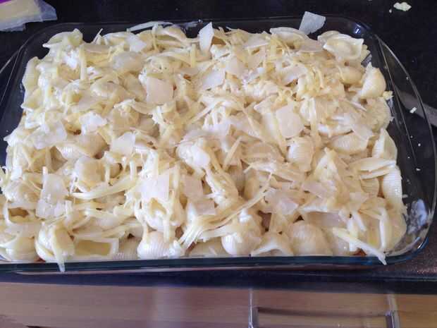 Cubrir con el resto del queso cheddar y parmesano si lo desea.