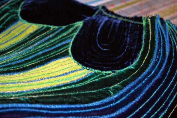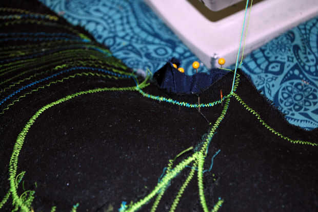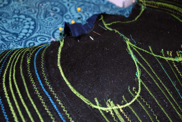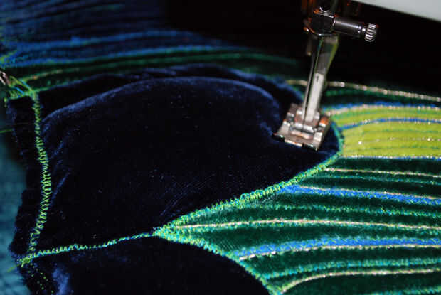 Era casi hora de edredón los ojos! Entregó la parte inferior del asiento para fijar los últimos bits de terciopelo en la parte superior. Ya que usé un hilo de bobina color contraste, es muy fácil ver cómo cosido abajo todos esos pedacitos de ajuste. Después de fijar el terciopelo abajo I zig-zag había cosido por los bordes superiores, había cortado el margen de costura sobrante y la vuelta la parte inferior del asiento al frente.