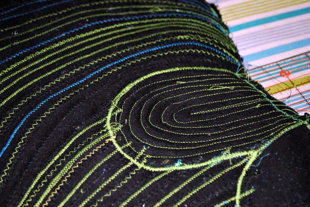 Cambié la máquina a hilo negro en la parte superior y usa una puntada recta para coser en acolchar líneas alrededor de cada óvalo, aproximadamente 1/4" de separación. La última foto muestra la parte trasera del asiento con el acolchado óvalos. Todo que acolchar mi muchas crestas de la misma altura.
