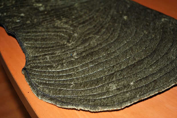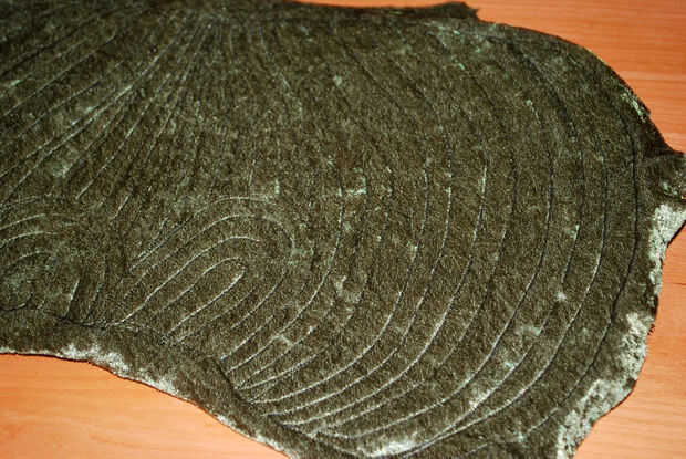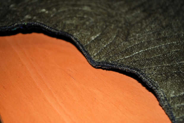 He presentado el terciopelo, plano hacia arriba, por debajo del cojín del asiento y cortar el terciopelo hacia fuera con sobre un margen de costura de 1". Me cubrió el respaldo hacia abajo con cuidado y directamente había cosido todas mis líneas de acolchado en negro. Por supuesto que sería un poco más rápido si lo hice al mismo tiempo como que me acolchar todo el terciopelo en la parte superior. Lamentablemente eso significa generalmente que el respaldo se desplazará alrededor mientras estoy trajinando con la parte superior y hacer un lío. Es más simple y más fácil hacia atrás, incluso si esto significa costura cada línea varias veces. También hace la pieza super fuerte.