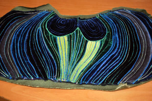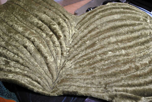 Respaldé el cojín de soporte lumbar y la parte inferior del asiento en verde oliva machacada terciopelo del estiramiento. Esta tela fue dejada sobre hacer asiento tentáculos para Pato de mecer el barco. Mis obras de arte de movilidad todos tienen telas en común, parcialmente porque odio perder buena tela y también porque es divertido. Al menos es divertido para mí. Telas compartidas significa que están relacionados con las obras de arte!