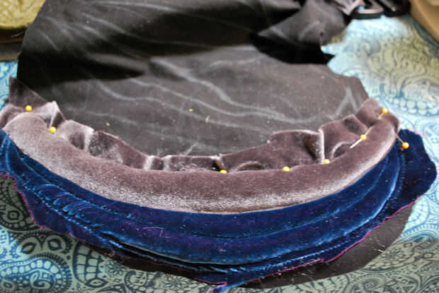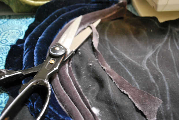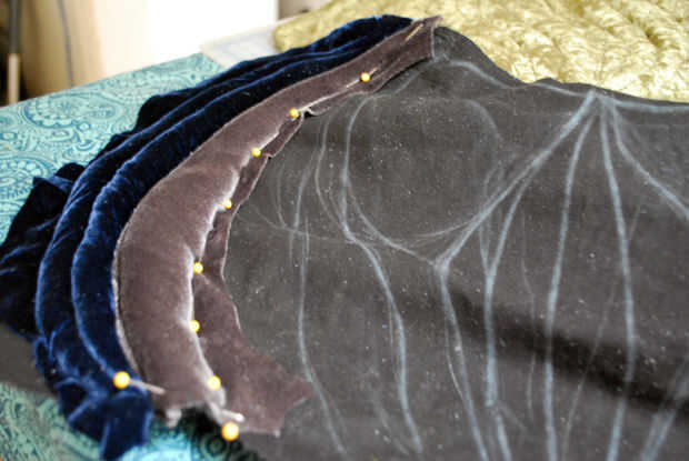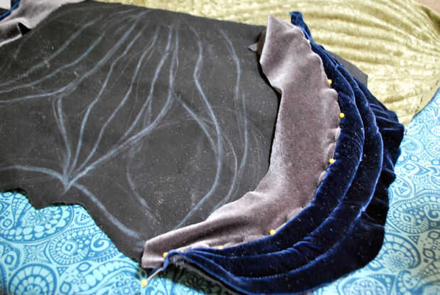 Para el siguiente conjunto de crestas utilicé terciopelo estiramiento profundo gris. Este conjunto de crestas necesita una técnica ligeramente distinta, ya que un lado de cada uno de los bordes cosidos sería visible. Terciopelo y terciopelo fray mucho cuando queda cruda corte los bordes, para que necesitaba añadir algún margen para doblar bajo y coser para crear los bordes acabados.