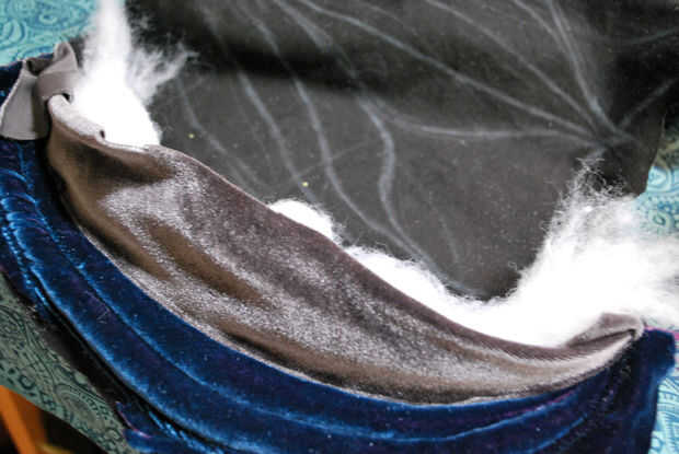 Una vez que los bordes fueron acabados, I relleno de cada canto, inmovilizados con cuidado y zig-llegamos a los bordes interiores. Coser una puntada recta por el centro de uno de los cantos grises, pero tiene realmente molesto en cómo mi costura resultó. El terciopelo era estirar fuera de forma como cosí, y tuve que parar, sacar mis puntadas y volver a coser las líneas un par de veces. Así que he cortado mi tela sobrante en el interior de la una cresta y decidió tomar un enfoque diferente en el otro lado. Primero, sin embargo, acolchado y cubrió la segunda cresta gris.