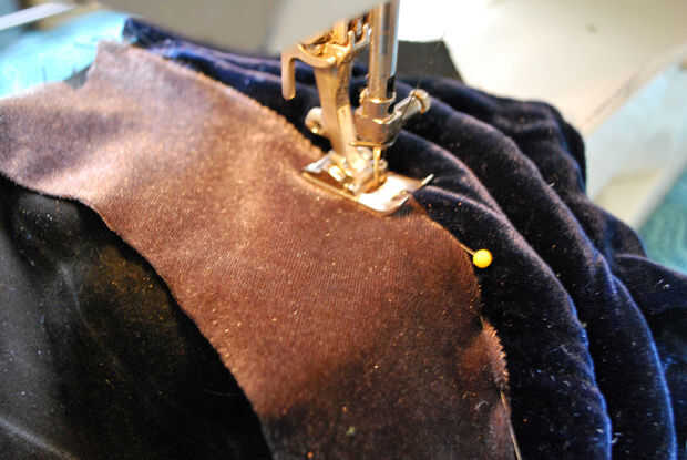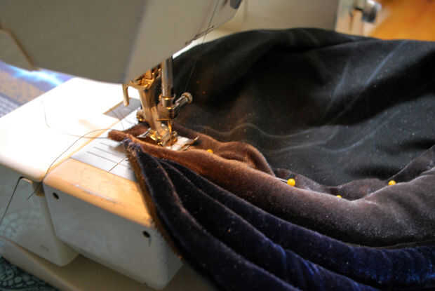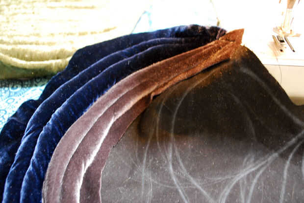 Cortar el terciopelo a la forma general de cada canto curvo, más cerca de 1/2" a cada lado. Cuidadosamente cubrió por un borde doblado sobre el zig-zag manteniendo el terciopelo azul. Conectar la máquina a un zig-zag estrecho, apretado y entonces lentamente cosido abajo del borde doblado. Esto acabó con el terciopelo gris y terciopelo azul en esa costura. Luego cosió el segundo lado.