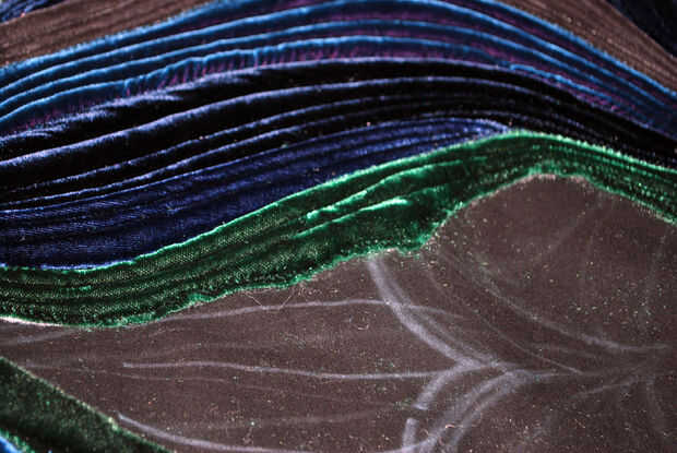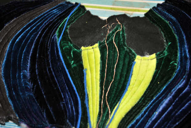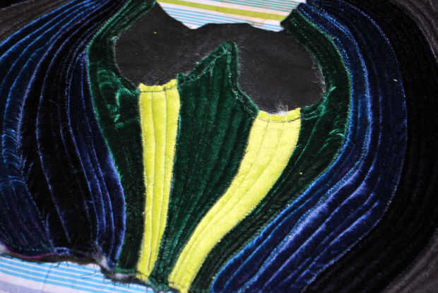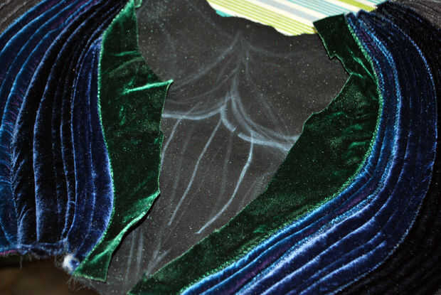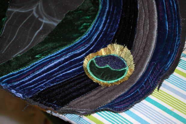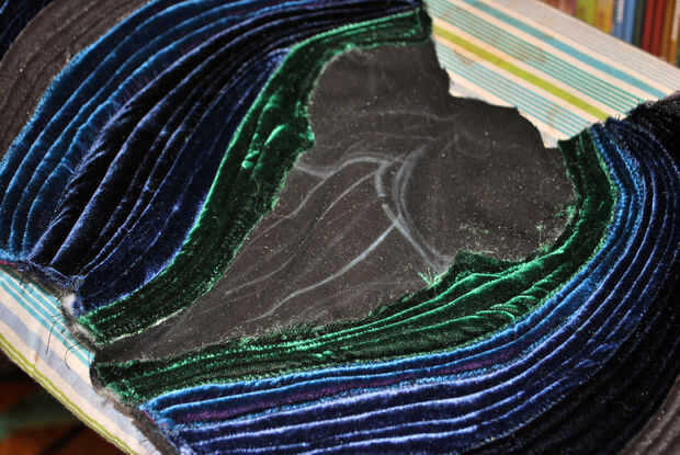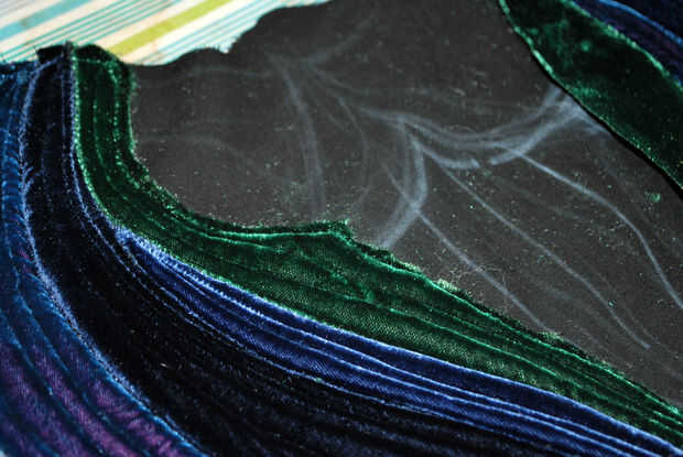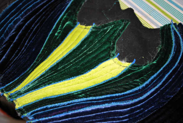 La doble pala en la parte superior del asiento es casi pero no del todo en forma de la base del ojo del pavo real. Que utiliza terciopelo verde para esta sección: el mismo que utilicé para mis pequeños ojos de pavo real y terciopelo chartreuse que era similar al color del hilo de algunas de mis hojas de pavo real color verde oscuro. El proceso era el mismo que las crestas acolchadas externas: pin y coser terciopelo doblado hacia abajo, agregar relleno, precisar el lado opuesto, coser los bordes y edredón de cada canto. La principal diferencia fue que forma cada cresta para seguir las curvas ovaladas hasta arriba. Cuando llegué a la Loma centro, doblé sobre ambos lados del terciopelo verde oscuro para acabar con todos los bordes verticales. Los bordes superiores de la curva serían esperar hasta más tarde.