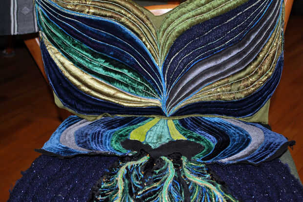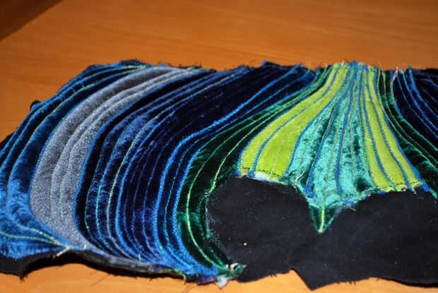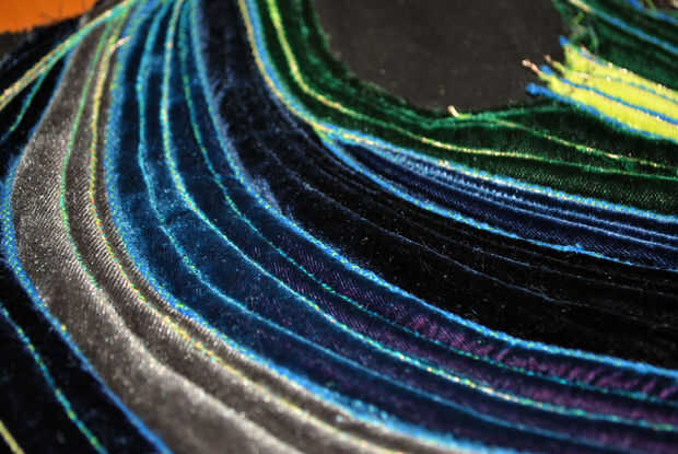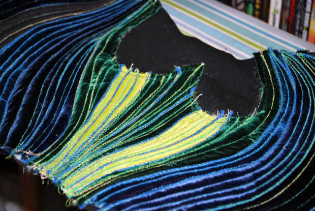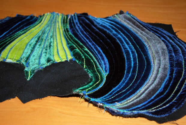 Cambié la máquina a un color verde brillante y el hilo azul y doble rosca de la aguja (consulta Zig zag plumosas hojas para más detalles) y filamentos acabados oro zig-llegamos en varias de las líneas de acolchado. Alternaron con los filamentos de la bufanda azul en algunas líneas acolchados, entonces hice mi zig-zag puntada un poco más estrictos y había cosido el resto de las líneas de acolchado en hilo simple. Los cantos terminados parecía mucho más a las plumas de pavo real! Entonces estaba listo para cubrir los óvalos desnudos pobres dejado en el asiento.