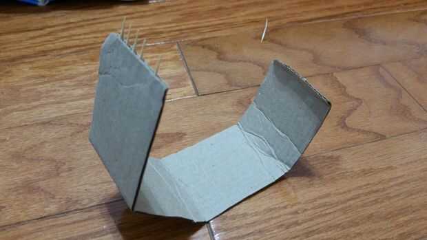 Corte una decente tamaño pedazo de la cartulina, debe ser suficientemente grande como para tener casi tan grande como una de las plumas de pavo real plegada en un cubo, que faltan dos caras aunque de un lado. Vea la foto como referencia. Tomar uno de los lados expuestos y doblar ligeramente, sólo para una pequeña parte. Insertar palillos de dientes en el otro expuesto lado y conectar los dos lados expuestos, haciendo un bonito cubo... casi.