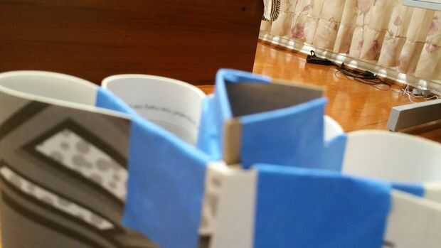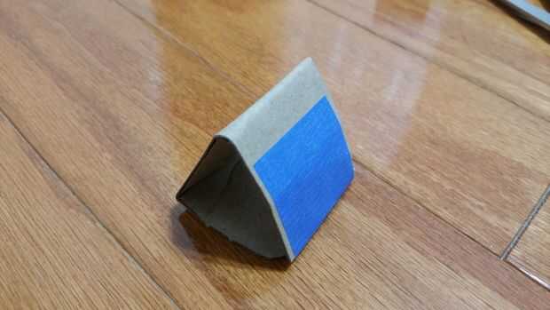 Cortar un trozo de cartón y luego doblar en un triángulo. Cinta para cerrar y para mantener la forma. Si usted tiene una cantidad impar de plumas, con la punta del triángulo hacia abajo, inserte el triángulo en la pluma del media dejando parte de lo expuesto. Cinta para sostener por todos los lados. Si tienes una cantidad uniforme de plumas, cinta en la parte superior el borde entre las dos plumas mediados cuidadosamente.
