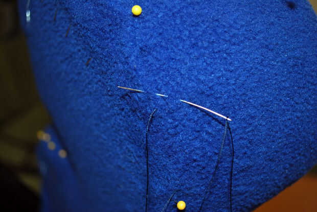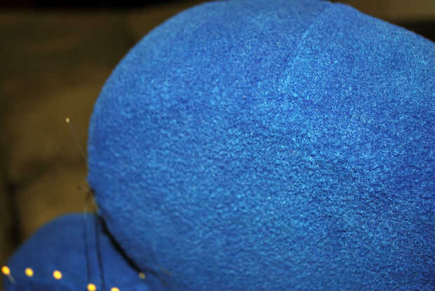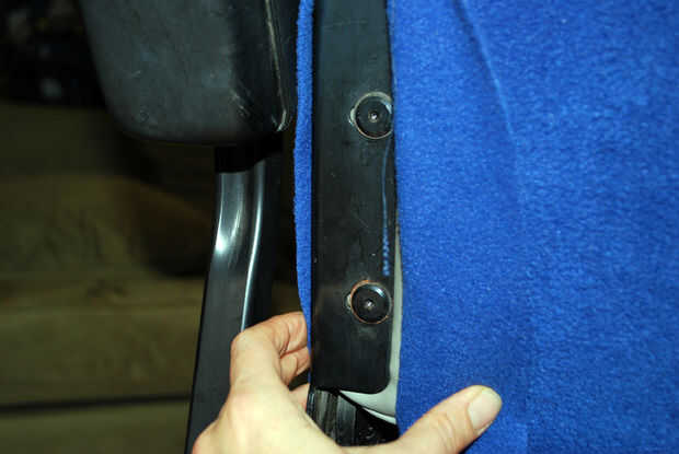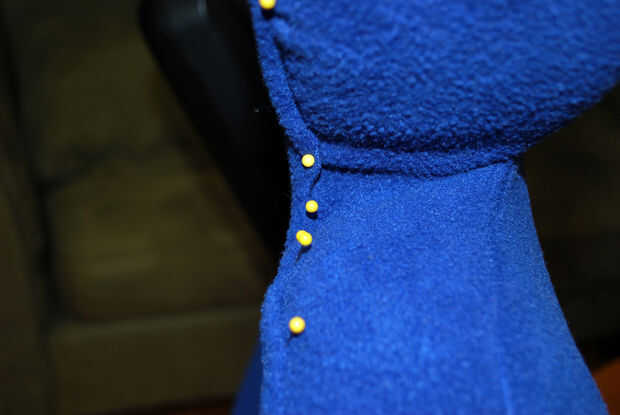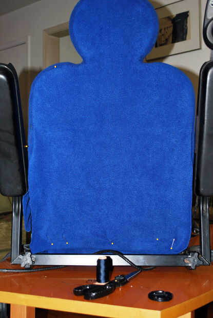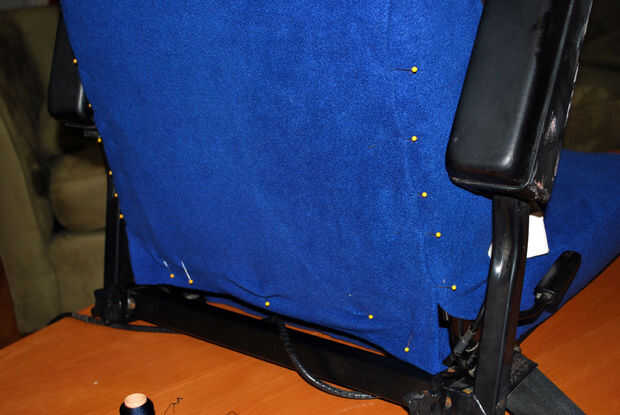 El área en la base de apoyo para la cabeza es lo que llama el cuello del asiento. Tuve a mi margen de clip y pin volver a él un par de veces para obtener esa curva pronunciada establecer muy bien, pero finalmente llegué. Luego rosca aguja de mi modista con hilo de alfombra Marina botón otra vez y llegó a la costura.