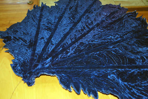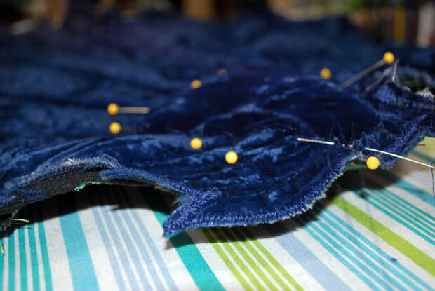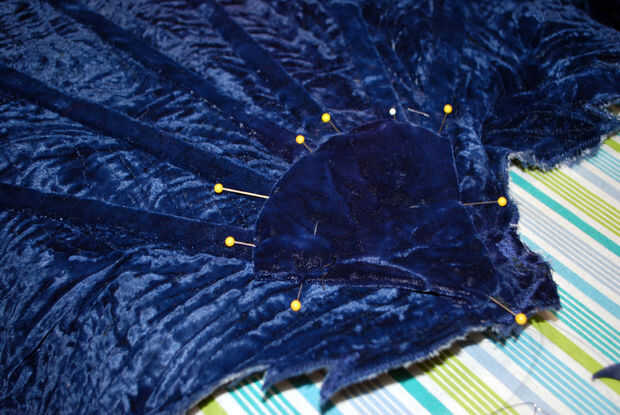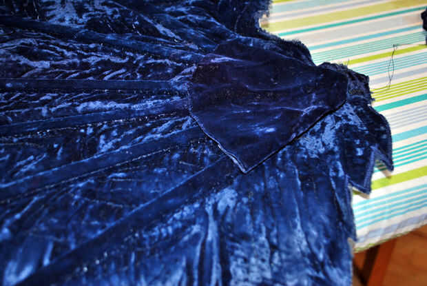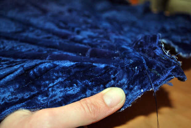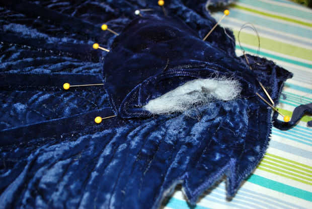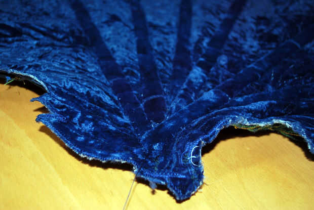 Es una solución simple, sin embargo. Primero acabó con todos los extremos de mis tripas de puntal. Entonces yo cortar un pastel en forma de cuña del terciopelo falda para cubrir la base del ventilador y todos los extremos del puntal. Me dobla los bordes cortados del terciopelo bajo para hacer un borde limpio agradable, cubrió en su lugar en la parte superior y hacia abajo de un lado y agregar algún relleno. Cubrió el borde abierto hacia abajo y deslizar-látigo había cosido terciopelo en la base del ventilador. Voila!