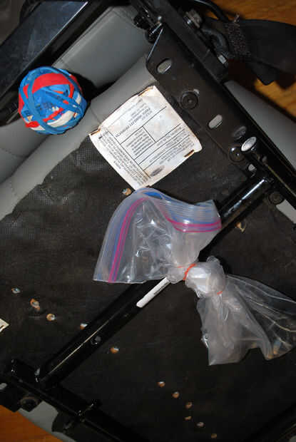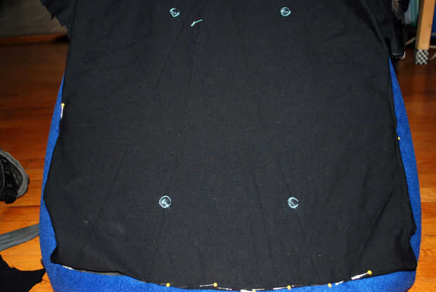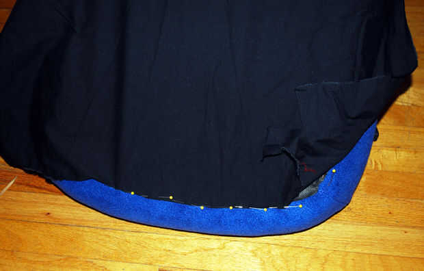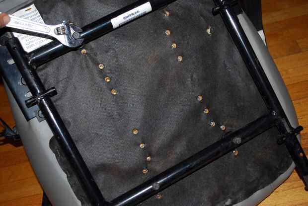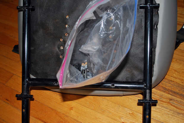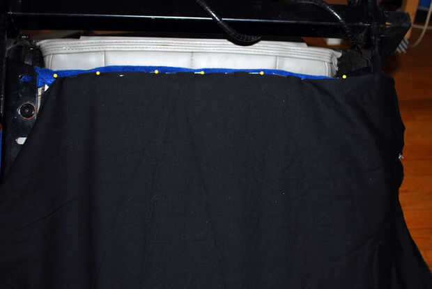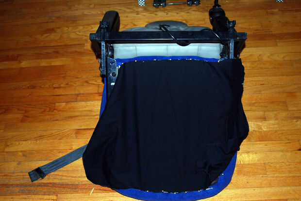En primer lugar, dio la vuelta el asiento para que la parte inferior del cojín del asiento era visible. Esa estructura rectangular con las barras transversales poco ayuda a fijar el asiento a la base motorizada. Quería probar y coser alrededor de él, así que bajé mi llave y comenzó a sacar los tornillos. Los pernos atornillan a través de la estructura metálica rectangular, arandelas con forma y luego a la base de madera del asiento. Quería asegurarse de que no se pierden, así que hice el tradicional truco de poner los tornillos y arandelas en una bolsita de plástico y fijándolos a la estructura con una banda elástica. Luego guarda el marco debajo de mi mesa de trabajo y salió de la funda de cojín polar azul y algunas tela de sarga de algodón polivinílico negro para la parte inferior del asiento. Elegí la tela cruzada porque es durable, y un poli mezcla porque es estable y menos probable que irrumpió en llamas que el algodón. Esta parte del asiento va justo en la parte superior del motor, después de todo, y no es para poner cosas realmente inflamable sobre piezas motorizadas.