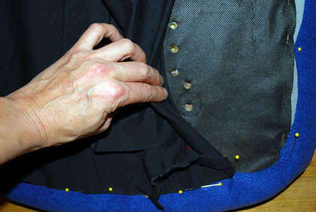 Corté la tela cruzada, por lo que fue un poco más grande que la parte inferior del asiento. Me había doblado sobre los bordes superior e inferior de la tela y comencé a fijar hasta el polar azul. Yo alternaba mi fijación de arriba a abajo y de vuelta para que yo podía mantener incluso la tensión. El paño grueso y suave simplemente estiró un poco y la tela cruzada no estira, así que tuve que ajustar mi fijando varias veces. La fijación derecha cerca del borde donde el cojín del asiento casi tocó el respaldo del asiento fue un poco difícil, pero posible.