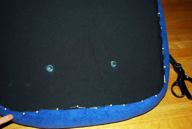 Antes que cubrió a los lados de la tela cruzada hacia abajo, quería marcar la colocación de mis orificios para los tornillos. De esa manera en que podía cortar pequeños agujeros en la tela sólo los puntos cuando llegó el momento de poner el marco nuevo. Yo peladas detrás la cruzada para encontrar los agujeros. Había un montón de agujeros, y no todas ellas eran útiles. Me encontré con una huella de lavadora claro a su alrededor, puso a la tela hacia abajo y marca los agujeros con un trozo de tiza azul. Entonces terminé de fijar abajo de los lados.