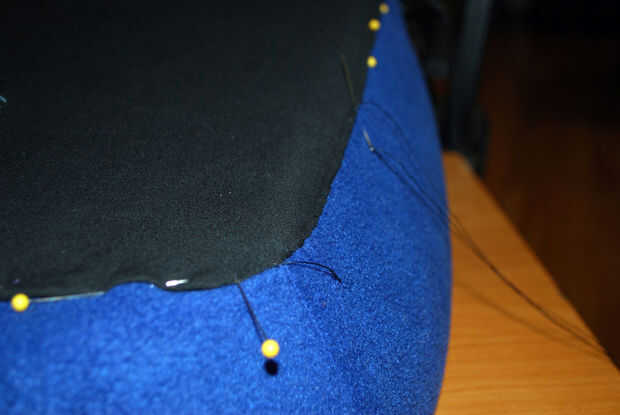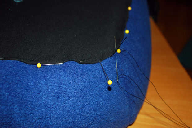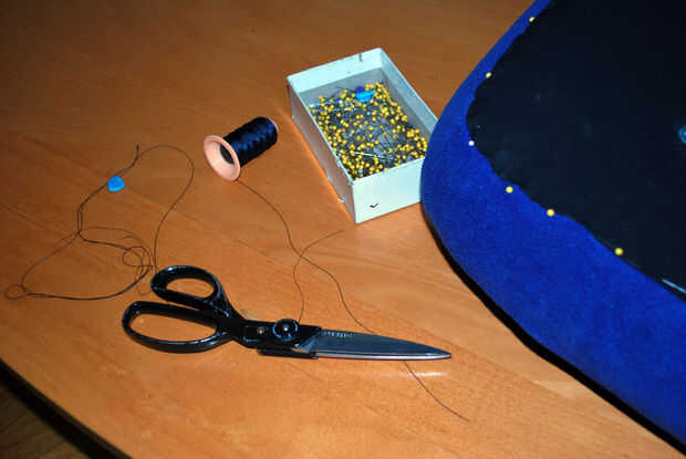 Una vez que se cubrió todo, puse el asiento en la mesa de trabajo / mesa de centro así que fácilmente podía trabajar en él. ¡ Salió mi suministros de coser de mano (alfileres, hilo, tijeras y agujas) y comenzaron! Cuando la tela está preparada y fijada bien, la parte de costura es una brisa. Rosca mi aguja con una sola longitud de hilo de alfombra pesada armada botón, anuda un extremo y el látigo / resbalón había cosido los bordes hacia abajo.