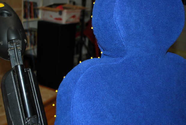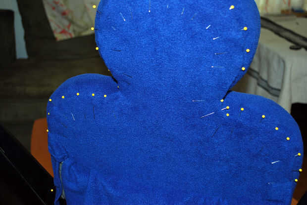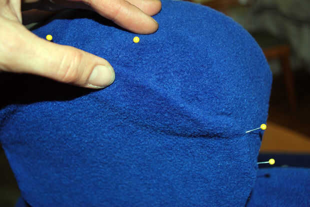 Luego llevó a cabo el respaldo de la silla y comenzó a prender en su lugar. Comencé desde la parte superior del reposacabezas, doblado sobre mi margen tenía un borde acabado de trabajar con y cubrió de lado a lado, manteniendo la tensión de la tela incluso. A veces eso significaba doblé bajo más de una 1/2" pulgadas, pero eso no importaba. La parte importante fue hacer un bonito borde liso. He trabajado hacia abajo desde la parte superior el "cuello" y "hombros" de la parte posterior de la silla, fijando otra vez de lado a lado. Cuando la parte superior se veía bien, tengo ganas de coser juntos. Pin y coser el resto de la espalda más tarde.