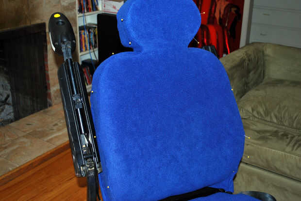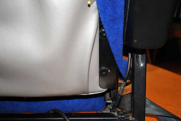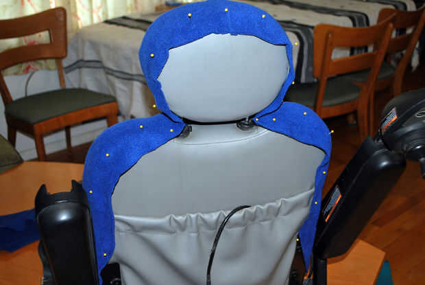 Primero poner la funda del asiento y los laterales sobre el asiento y puestas en su lugar. Sólo apuñaló a los pernos en el vinilo y trabajado desde la cima hasta el fondo. Trataron de mantener el paño grueso y suave tan suave como sea posible y movió los brazos hacia arriba y hacia abajo para que el paño grueso y suave podría ir alrededor de los lados en la parte posterior. Como llegué a la parte inferior, había algunos lugares que simplemente no podía pin! La estructura metálica que sostiene el asiento junto a pusiera en el camino. No importa. Los bordes a la pieza posterior del perno y fundas equipada derecho sobre el área. El borde inferior muy fue complicado, pero sólo pude tire del borde de la tela debajo del labio inferior y pin en su lugar. Sin duda, fue un poco descuidado, pero fijarían más adelante.