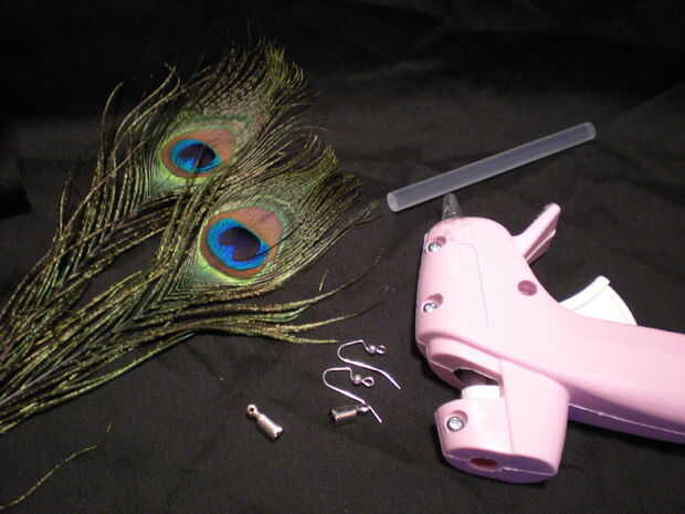 Materiales Pluma del pavo real - 2 Tapas - 2 Fornituras de pendientes - 2 Pistola de pegamento caliente (opcional pero recomendado) Palillo del pegamento caliente (opcional pero recomendado) Tijeras Pinzas de punta de aguja