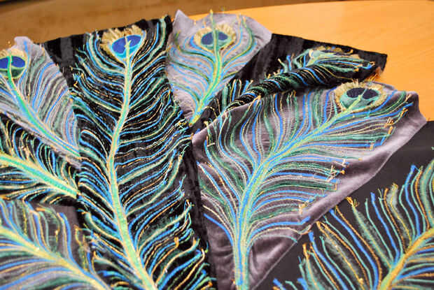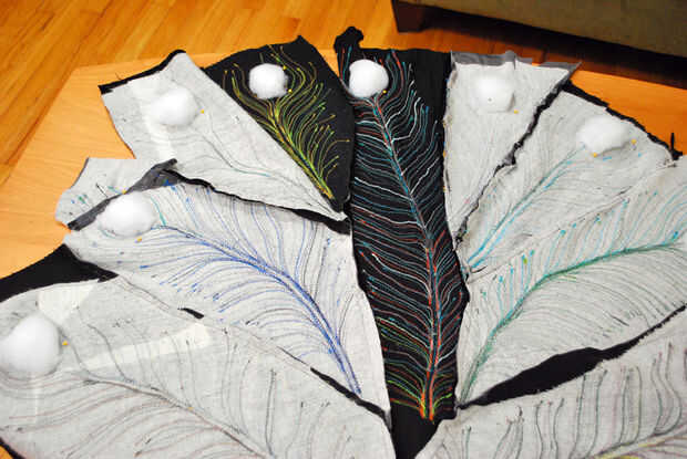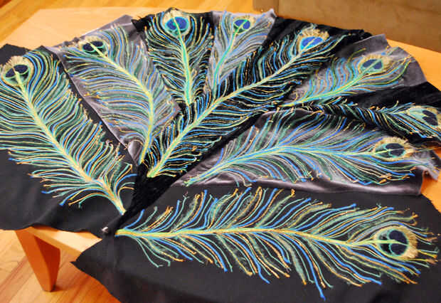 En la última foto, se puede ver la parte posterior con las costuras recortadas y los penachos pequeños de bateo en cada pluma de pavo real "ojo" listo para coger la costura.
