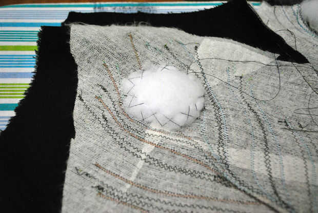 Luego continuar todo el camino alrededor de mi puff acolchado, coger un poco de la tela del forro como ir. El hilo que estoy usando es oscuro, por lo que no se verán mucho en el exterior aunque mi puntadas son un poco demasiado profundas. Tire un poco el hilo de como ir para que la tela sigue la curva de mi acolchado. Esto añade textura dará algunos "pop" a los ojos de pavo real. Una vez he cosido todo el camino alrededor, nudo de mi hilo y pasar a la siguiente vista. Les termino todo apagado y listo! Ojos de pavo real acolchado!