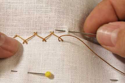 La puntada que utilicé para colocar mi pufs se llama una puntada de captura o un punto de Cruz. Tradicionalmente se utiliza para dobladillar (ver la primera foto). La idea es coser en un movimiento hacia atrás, sujetando los bordes del acolchado y haciendo sólo una pequeña puntada a través hacia el exterior de la tela. Esta puntada permite para algunos y movimiento en la parte posterior del ventilador de la pluma, que será muy útil más adelante cuando todo edredón hacia abajo firmemente.