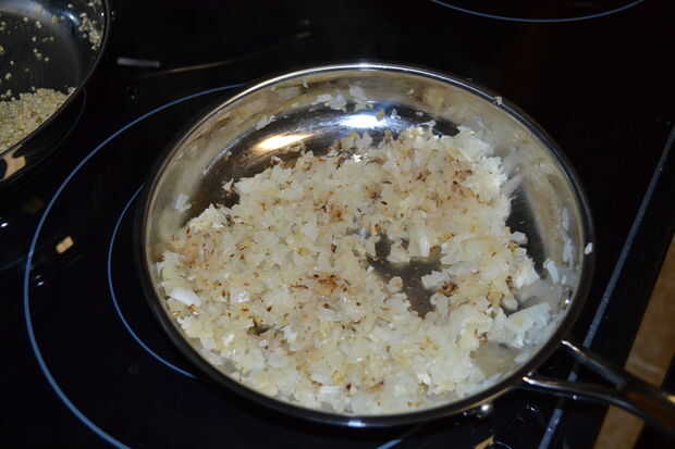 1. calentar el aceite de oliva en una sartén sobre fuego medio. Revuelva en la cebolla; cocinar y revolver hasta que la cebolla haya ablandado y se volvió transparente, aproximadamente 5 minutos.