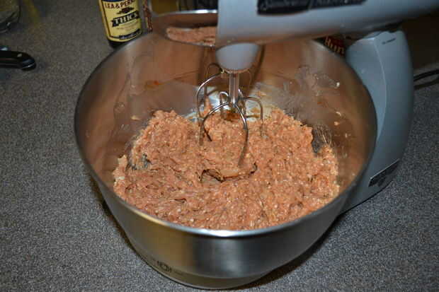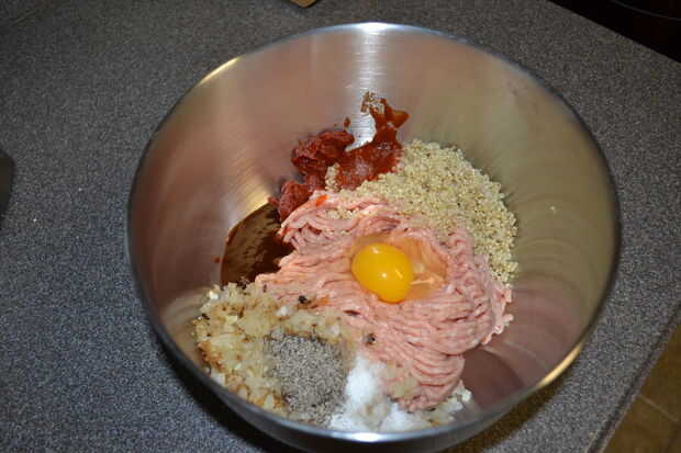 1. Mezcle el pavo, cocinado quinua, cebolla, pasta de tomate, salsa picante, 2 cucharadas de Worcestershire, huevo, sal y pimienta en un tazón grande o mezclador hasta combinar bien. La mezcla húmeda, no insistir sobre esto.