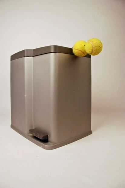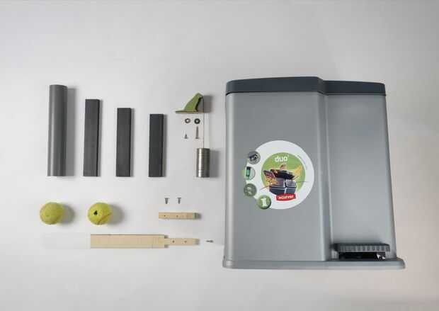 En este producto DIY añadimos pesas para mantener la papelera con conexión a tierra y en su lugar. También agregamos un sistema de polea pequeña a la tapa para que la papelera se abre y cierra fácil. Finalmente hemos añadido un juguete para que el perro puede abrir y cerrar la papelera instintivamente con facilidad.