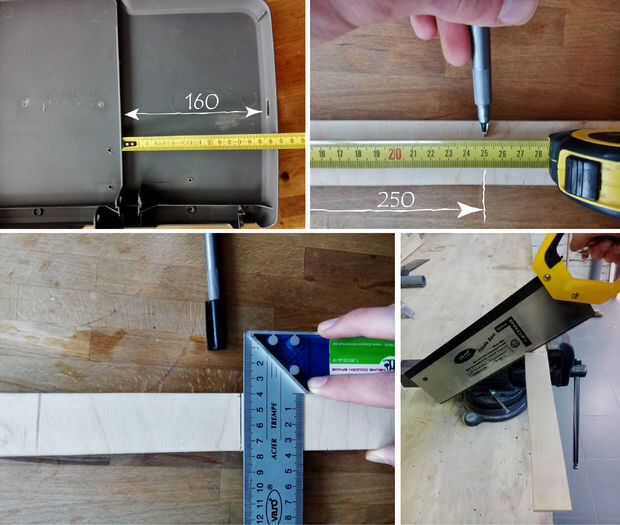 3. sierra el listón de madera a una longitud de longitud → por dentro de la tapa (160) + longitud fuera de la papelera (90) = 250 mm
