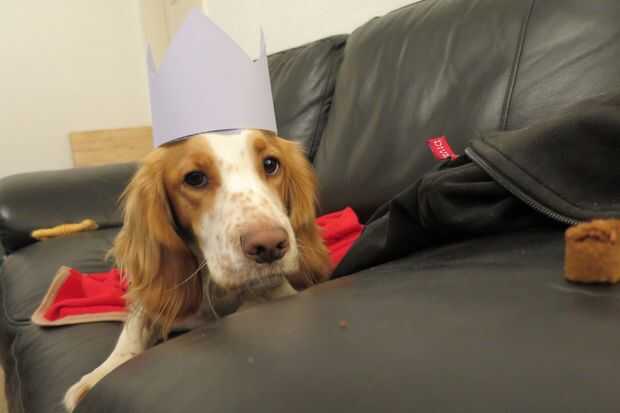 Usando colores de la tarjeta, cortar un diseño de sombrero y comprobar para el tamaño de su mascota (ella no estaba impresionada!!!!). Aquí he cortado una hoja A4 a lo largo del lado largo y pegado junto para alargar. Pegar el sombrero con el pegamento y dejar para secar.