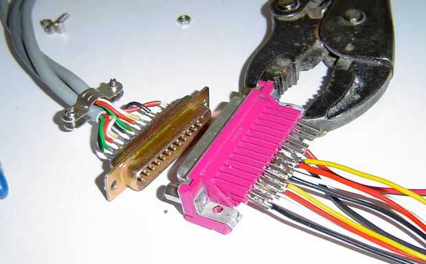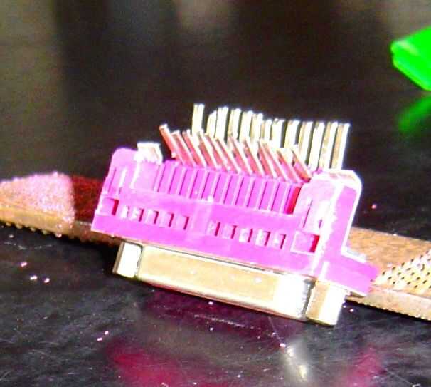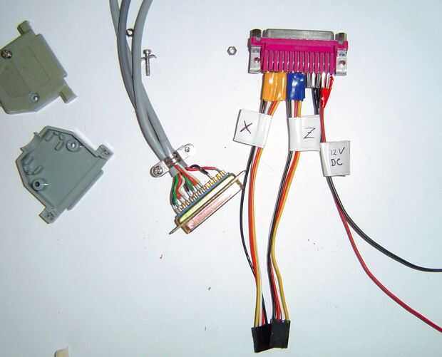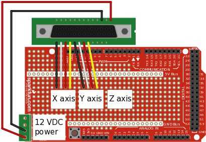 Había Ripeado un puerto paralelo de una computadora PC muerto por recortes de los cables que se sueldan a la Junta. Los soportes de plástico sobrantes se presentaron fuera y los agujeros de montaje fueron agrandados. A los 10 pines en el cuadro de la soldadura de cables. He usado los 4 cables que vienen con mis pantallas LCD I2C utilizadas en otros proyectos. Los colores no son importantes pero es mejor para que coincida con los cuatro primeros colores con los cuatro justo después de los. Los cuatro primeros enchufe en el eje x el segundo conjunto de cuatro en el eje y. El eje Y se usa debido a problemas con gcode arcos no se implementará para el eje Z. Obtiene soldar el cable rojo al pin 14 y negro a 16. No se utiliza el PIN 15. Estos conectarse a los terminales de tornillo primero y segundo en el tablero de rampas. Ventilador 12 VCC se conecta directamente a los mismos dos terminales. La imagen de Fritzing contribuirá con la localización de que cables se conectan a que pines del puerto paralelo. Fritzing no tenía un tablero de rampas pero este escudo rojo tiene la misma huella.