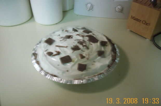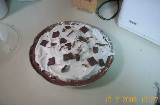 Es un gran pastel de chocolate delicioso. Hecho de Pudin de chocolate, cool whip, una barra de chocolate con leche y una tarta hecha listo.