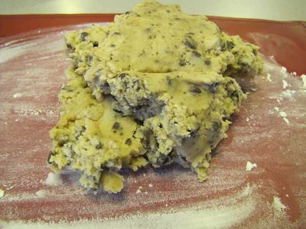 3. tomar aproximadamente la mitad de la masa para galletas restantes y smoosh en una tapa de "costra" en la hoja de hojaldre