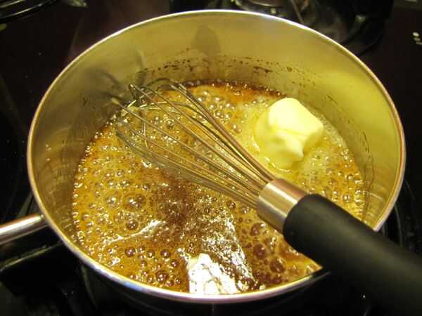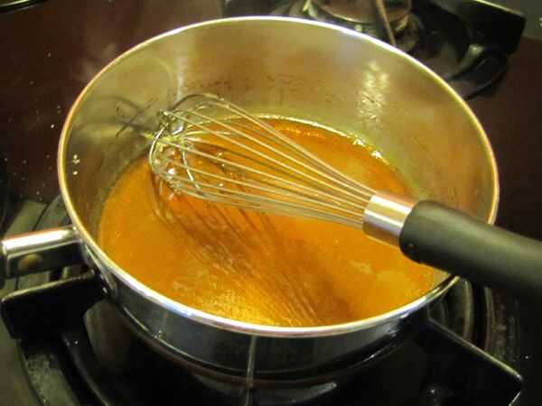 4. cuando el azúcar se vuelve un color ámbar añadir la mantequilla y bate hasta que se derritan
