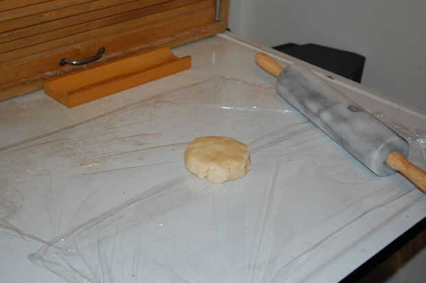 Aplane la bola ligeramente con la mano, luego cubrir con otra hoja de saran.