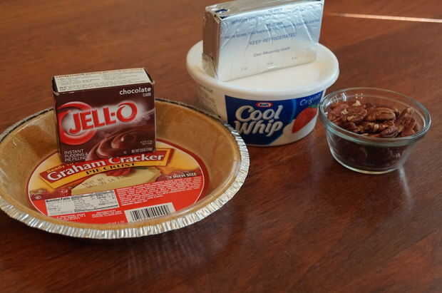 2 paquetes de pudín Jell-o chocolate 3,9 oz 1 paquete de 8 oz de crema queso 1 bañera de Cool Whip 1 costra de galleta 1 1/2 tazas de leche 1/4 taza azúcar Opcional: nueces y chispas de chocolate para decorar