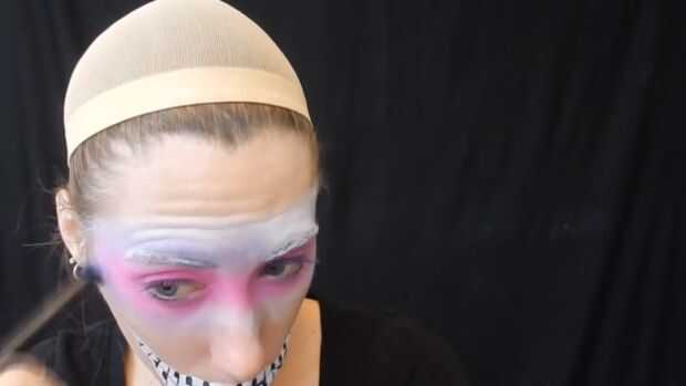 Utilizando un lápiz delineador de ojos jumbo que puse como base, luego utiliza sombra de ojos rosa caliente en el centro y mezcla una lavanda púrpura a la rosa y a la piel.