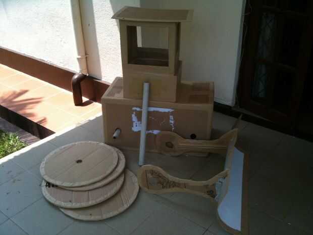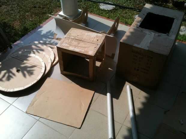 Como se puede ver en las imágenes... es cajas de cartón todos!! Para las ruedas me adjunta 2 cajas de cartón a contrapelo... luego con cinta los bordes así que dí un acabado agradable. Para el eje tengo tubos de cartón largos (lo encontrarás en tiendas de material! se lo daremos gratis una vez que la longitud del material!). El levantamiento en armas (no sé cómo se llama)... bueno... como los niveles pegué 2 tableros para arriba y corte la forma... luego reforzado los brazos con palillos de plástico y con cinta lo up...i también tiene una luz de cartulina y caliente la pegados a los brazos.