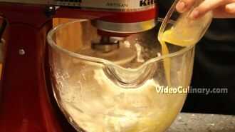 Mezclar a velocidad baja, añadir la mezcla de yogur y huevo. Mezclar durante un minuto, añadir 50 gramos de mantequilla derretida y mezclar solo hasta incorporar.