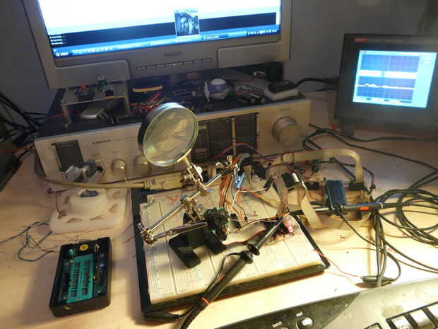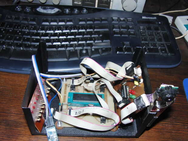Finalmente aquí está una foto del proyecto en la etapa de prototipo y su aspecto final en una caja con un USB de 5 pines CP2102 módulo convertidor de serie (bueno para deshacerse de los interfaces del MAX232 para puertos serie del PC) y un tablero de LED cutre para el puerto no utilizado en la tarjeta de la foto. La imagen de la cam fue de baja calidad debido al ruido de la placa, y cuando me mudé el sistema a un PCB con planos de tierra enorme, la calidad se acercó a 6-bits de 4 bits. Unidos es el firmware Hitech PICC18, Borland VC ++ código y ejecutable (más película de muestra puedes jugar seleccionando el último fotograma, como abrir una película en el ejecutable, usar los botones del ratón para acercar y alejar, el resto debería ser fácil de entender), esquemas y PCB en Proteus Isis / Ares, PCB en formato PSD, el tratamiento de prueba y y las fichas necesarias. También aquí hay un video mío (720p) para mostrar el lado de la PC del proyecto en acción con uno de mis propios temas como música de fondo. Soldadura feliz a todos :)