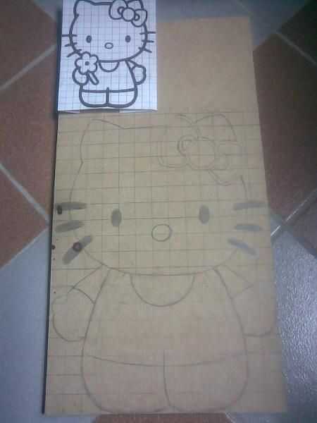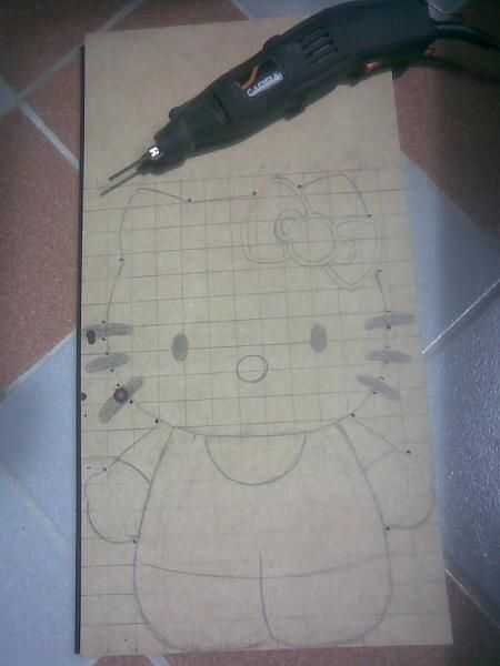 Luego, pasamos la imagen de Kitty a la madera, y usé el minitorno (o un taladro) para hacer unos agujeros para la caladora no se pase de las lineas y pueda palos mejor.